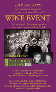 NEW GARDEN — Kennett Square Area local folk band The Rose Project invites you to a great night of local music, fun, food, and wine at Paradocx Vineyard on July 25th from 5-9pm. Downingtown band The Jayplayers will be opening at 5:15 and The Rose Project will perform music from their first recorded album beginning at 6:30. Tickets can be purchased online or at the door. $10 admission includes...