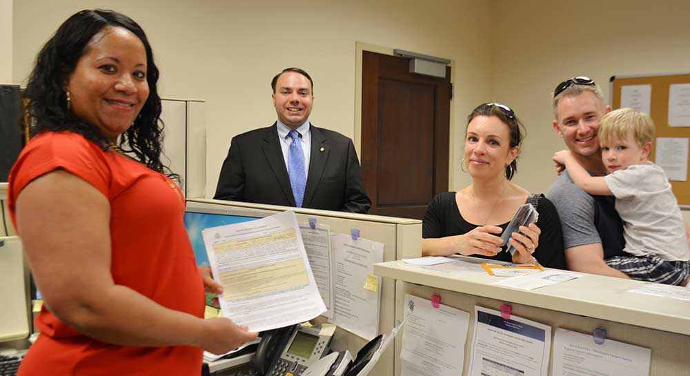 Chester County Passport Agent Jennifer Rivas (left) and Chester County Prothonotary Matt Holliday (center) with Chester County residents who are renewing their passports.