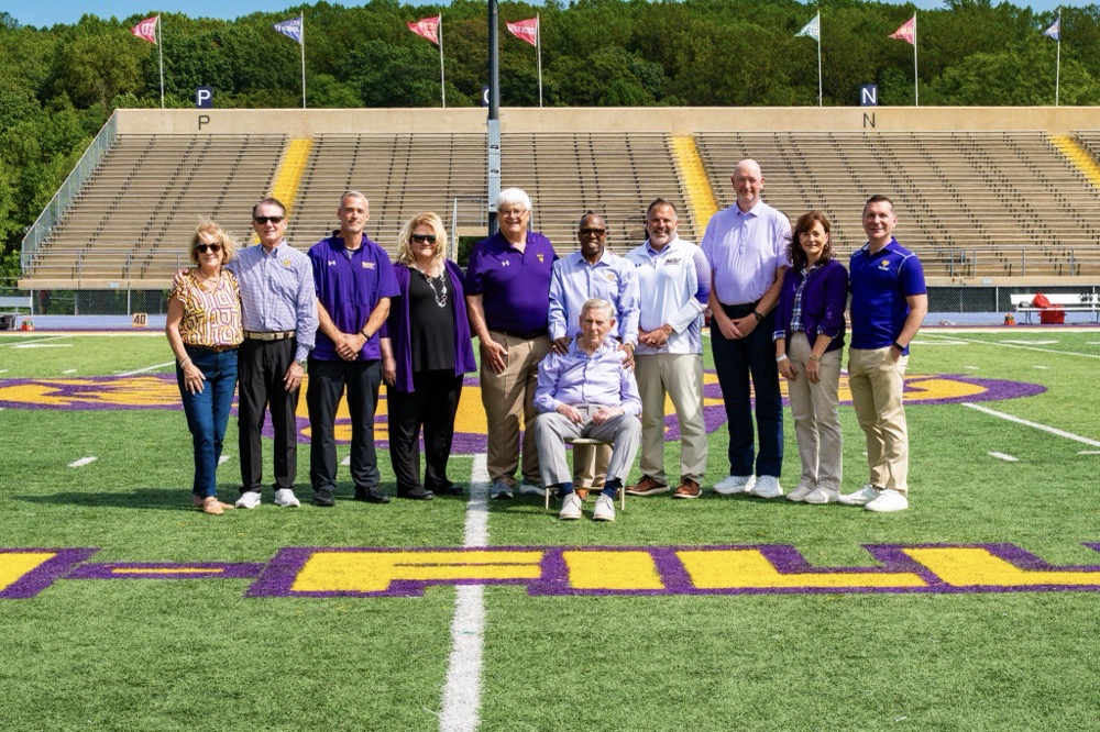 L to R) Pictured on Tomlinson-Fillippo Field are Agnes Ware, Roger Ware ’82, Head Football Coach Duke Greco, West Chester University President Dr. Laurie Bernotsky, Robert “Tommy” Tomlinson ’70, Tom Fillippo ’69 (sitting), Vice President for University Advancement and External Affairs Dr. Zebulun Davenport, Vice President of University Affairs and Chief of Staff Andrew Lehman, Director of Athletics Terry Beattie, Executive Director of the West Chester University Foundation Deb Cornelius, and Interim President of Commonwealth University Dr. Jeffery Osgood, Jr.