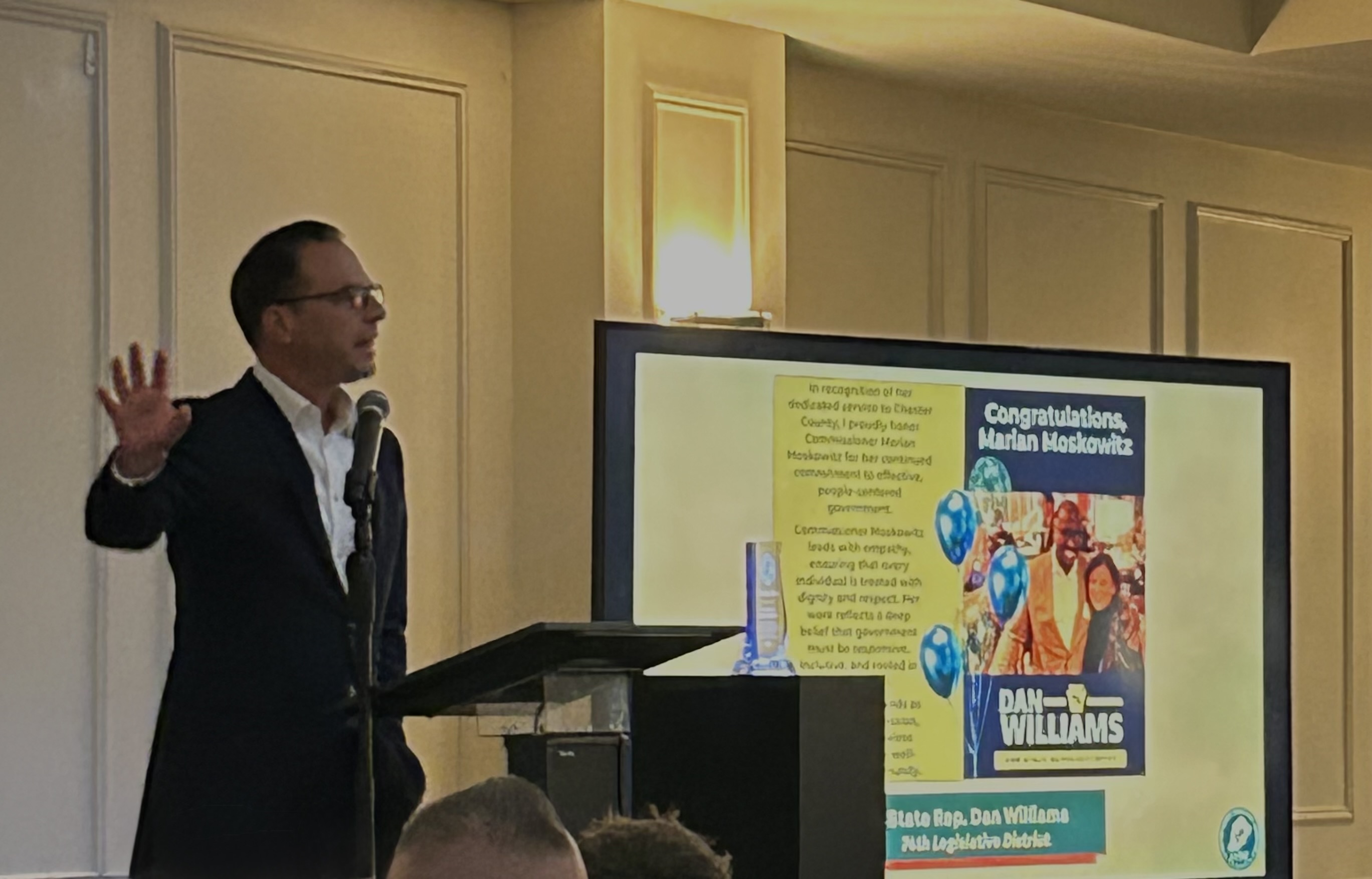 The Chester County Democratic Committee (CCDC) honored Chester County Commissioner Marian Moskowitz with the Chester County Democratic Leadership Award at a banquet held at the People’s Light Farmhouse in Malvern on 10/22/25.