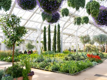 Inside, they can bask in a world of warmth that features an overhead garden of hanging baskets adorned with such vibrant beauties as jasmine, cape-primrose, and lipstick-plant.