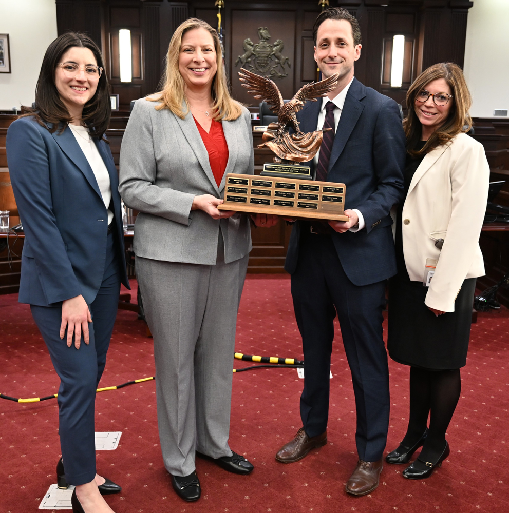 The Chester County Drug Court Team was presented with a Commendation Award for their partnership and outstanding commitment to addressing substance use disorders through a treatment-focused approach within the criminal justice system. Through the dedicated efforts of President Judge Ann Marie Wheatcraft, District Attorney’s Office, Public Defender’s Office, Department of Drug and Alcohol Services, and Adult Probation and Pretrial Services, the drug court team helps non-violent offenders suffering from drug addiction. The program was founded in 1997. Since its inception,1,652 people have completed the program—a 62% completion rate. Approximately 95% of those who completed the program were employed at the time that they graduated, and 87% of those that completed the program were arrest-free for at least the next two years of their life.