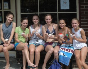 After a morning workout at the Kennett Y, Unionville High students Jill Jaycox (from left), Olivia Young, Mckayla Mawn, Anne Birkenmaier, Courtney Smith, and Emily Fisher savor an ice-cream break. They learned after their purchase that the store hadn’t yet “officially” opened for the day.